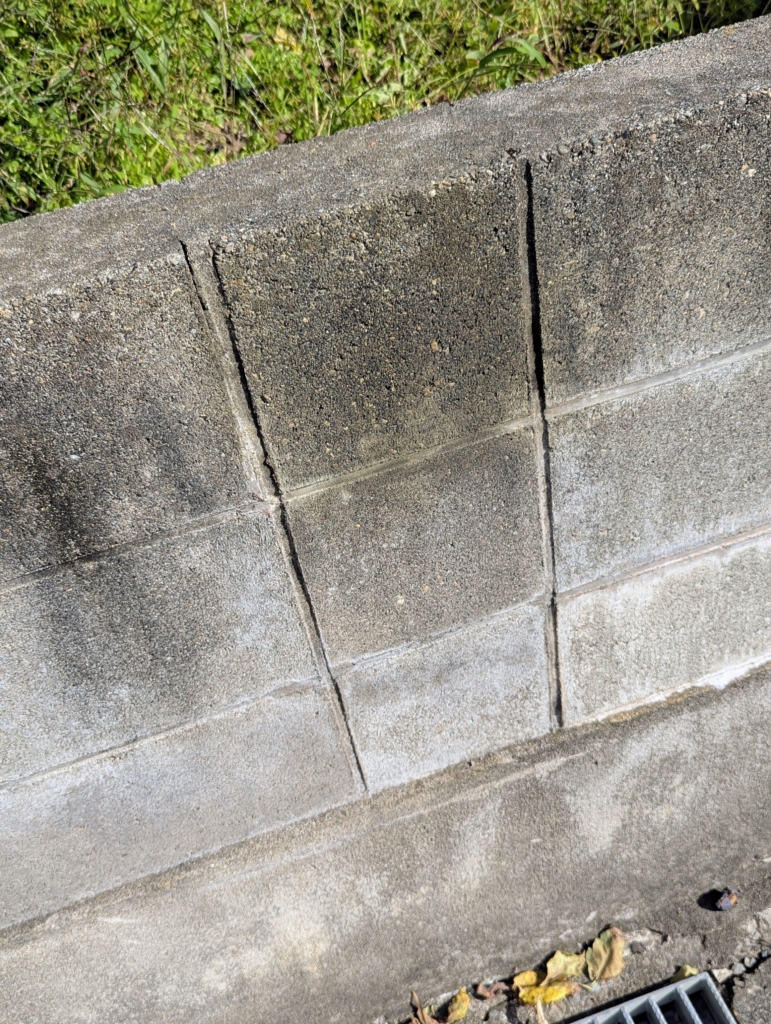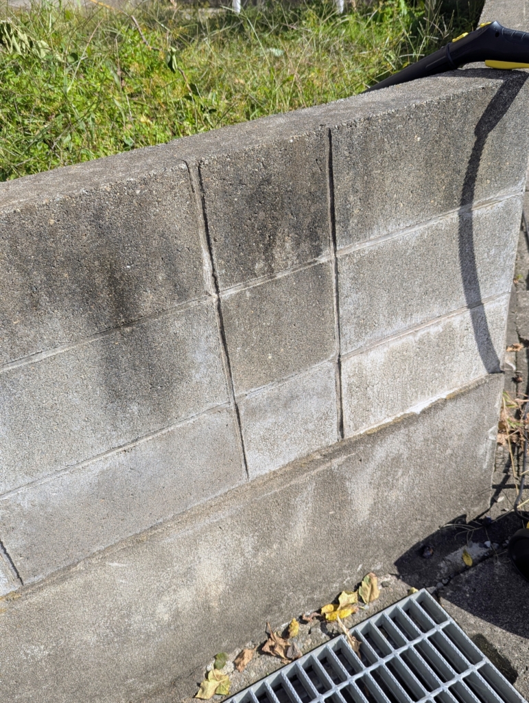 掃除前のブロック塀。スチームでジュワーっと。