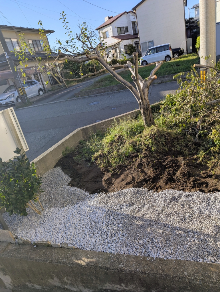 玄関周りの草むしりをして砂利を敷いた。