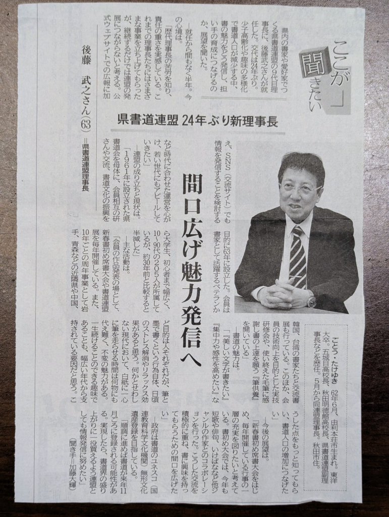 まだ60代前半かな。お若い感覚も持ち合わせているので、これからの秋田県書道界をどう変えていくか期待が膨らみます。