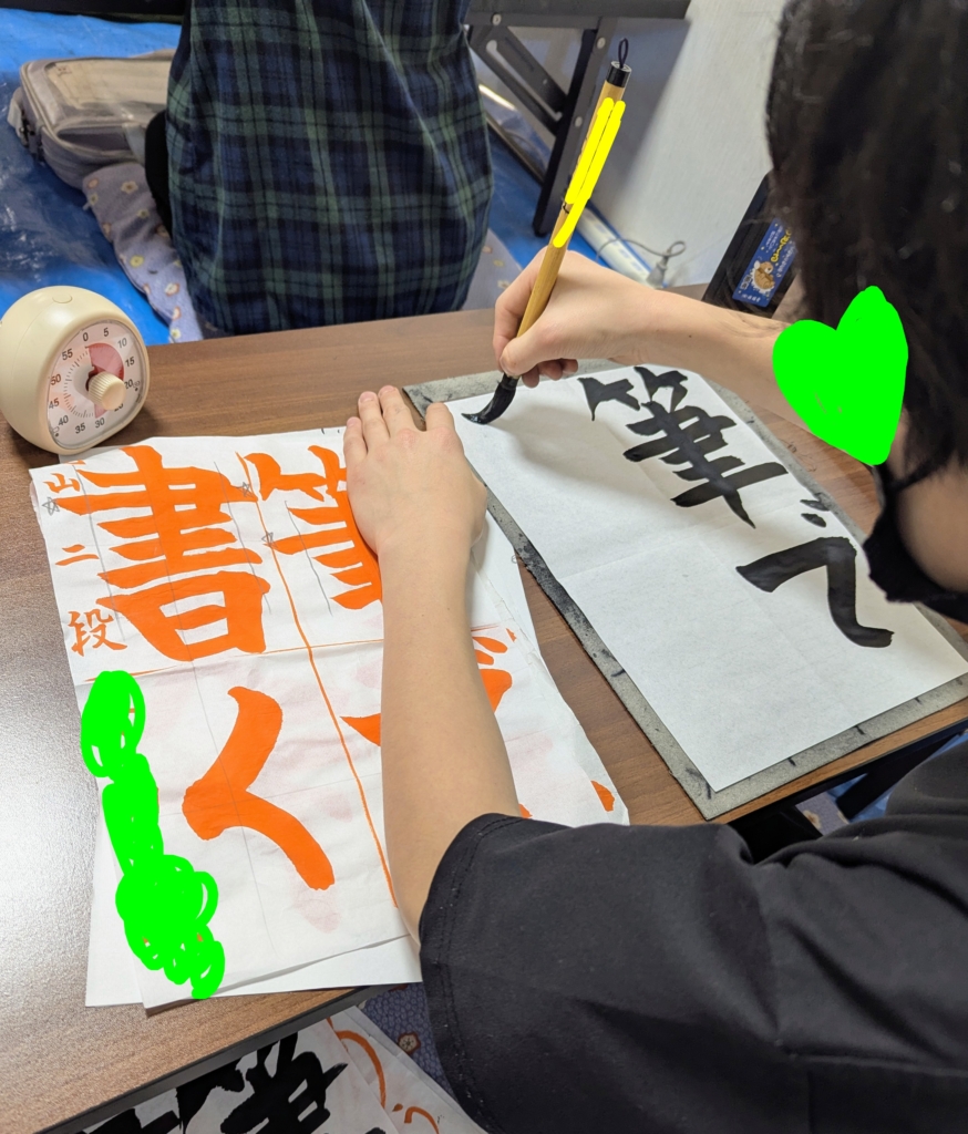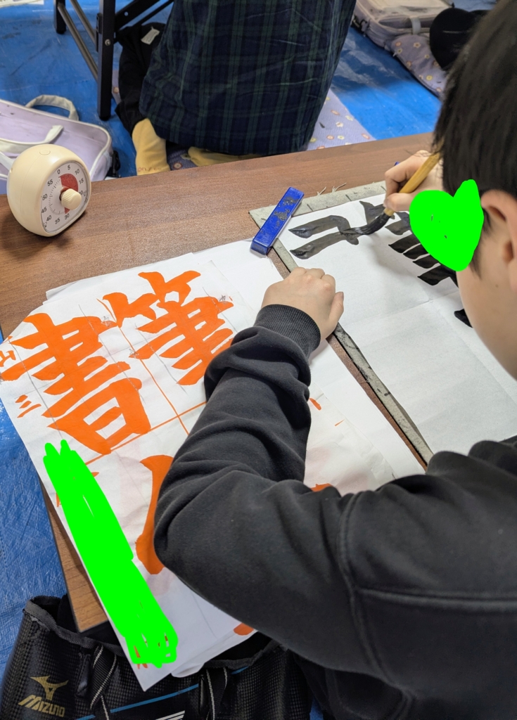 墨をつけた筆を持ってキョロキョロしはじめるのが低学年。