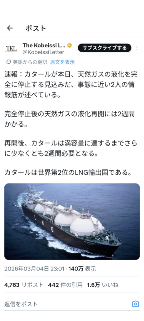 カタールのLNGが生産ストップ。