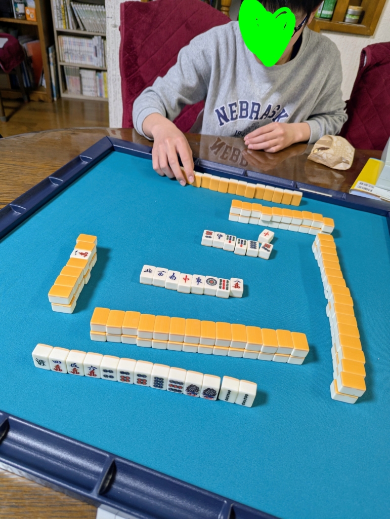 次男は清一色を上がって大喜び。2人でやると30回くらいツモれるからね。