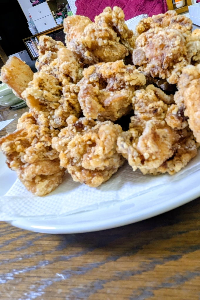 6人家族なので鶏モモ肉3〜4枚使うんだよねー。揚げるの大変なのだよ。