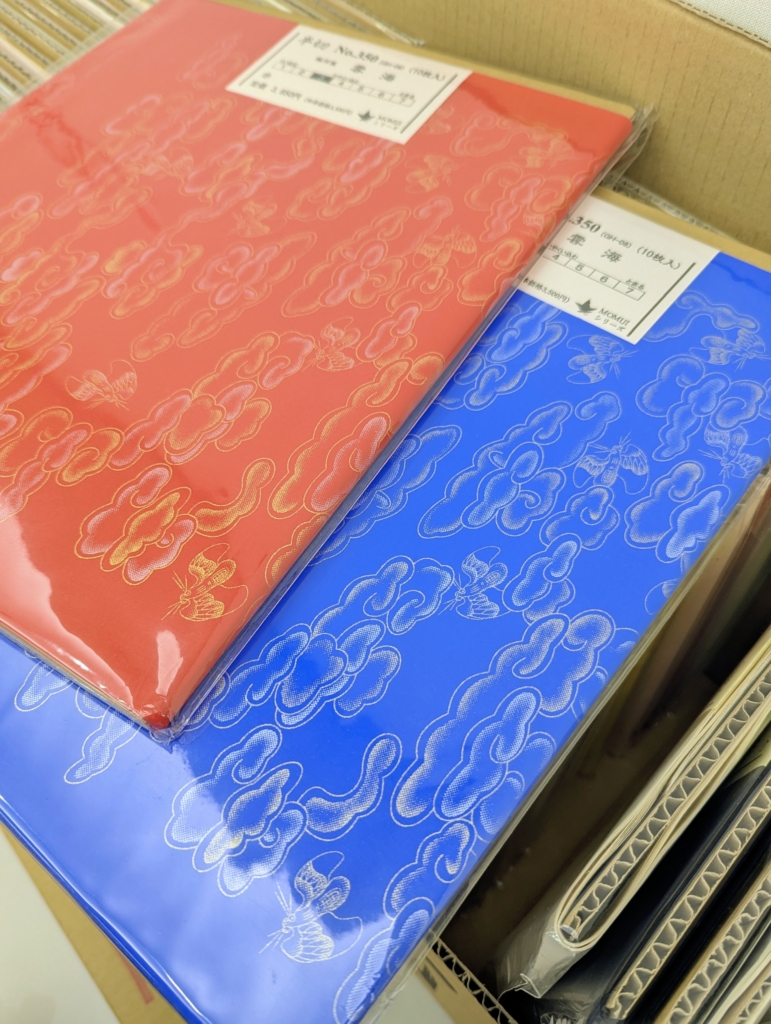 こんな派手なものは選びませんでしたが(笑)、私もカラー画仙紙をいくつかキープしてきました。